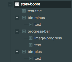 text-title: グループのタイトルのテキストText Element。グループの上部に固定されています。btn-minus: Image Elementで、子にText Elementが含まれています。これが私たちのマイナスボタンで、グループの左下にアンカーされています。btn-plus: Image Elementで、子にText Elementが含まれています。これが私たちのプラスボタンで、グループの右下にアンカーされています。progress-bar: グループの下部にアンカーされたプログレスバー。背景のImage Elementで、2つの子要素が含まれています:image-progress: 実際にプログレスを表示するリサイズ可能なImage Element。progress-bar要素の左にアンカーされています。text: プログレスバーを表示するText Element。progress-bar要素の中央にアンカーされています。