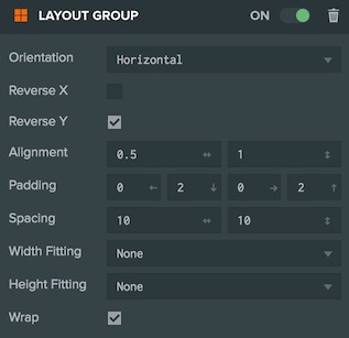 このボタンの行は、グリッドを設定するためにラップ設定が有効化されたレイアウトグループを使用してレイアウトされています。レイアウトグループがアタッチされているグループエレメントは、2列のグリッドを生成するために強制的にラップするように正しい幅(ボタンの幅 + スペーシング)に設定されています。水平レイアウトは、グリッドが列ではなく行で埋まることを意味し、アライメントプロパティは[0.5, 1]に設定されているため、どんな"緩い"要素(要素が1つだけの行)もX軸で中央に配置されます。
