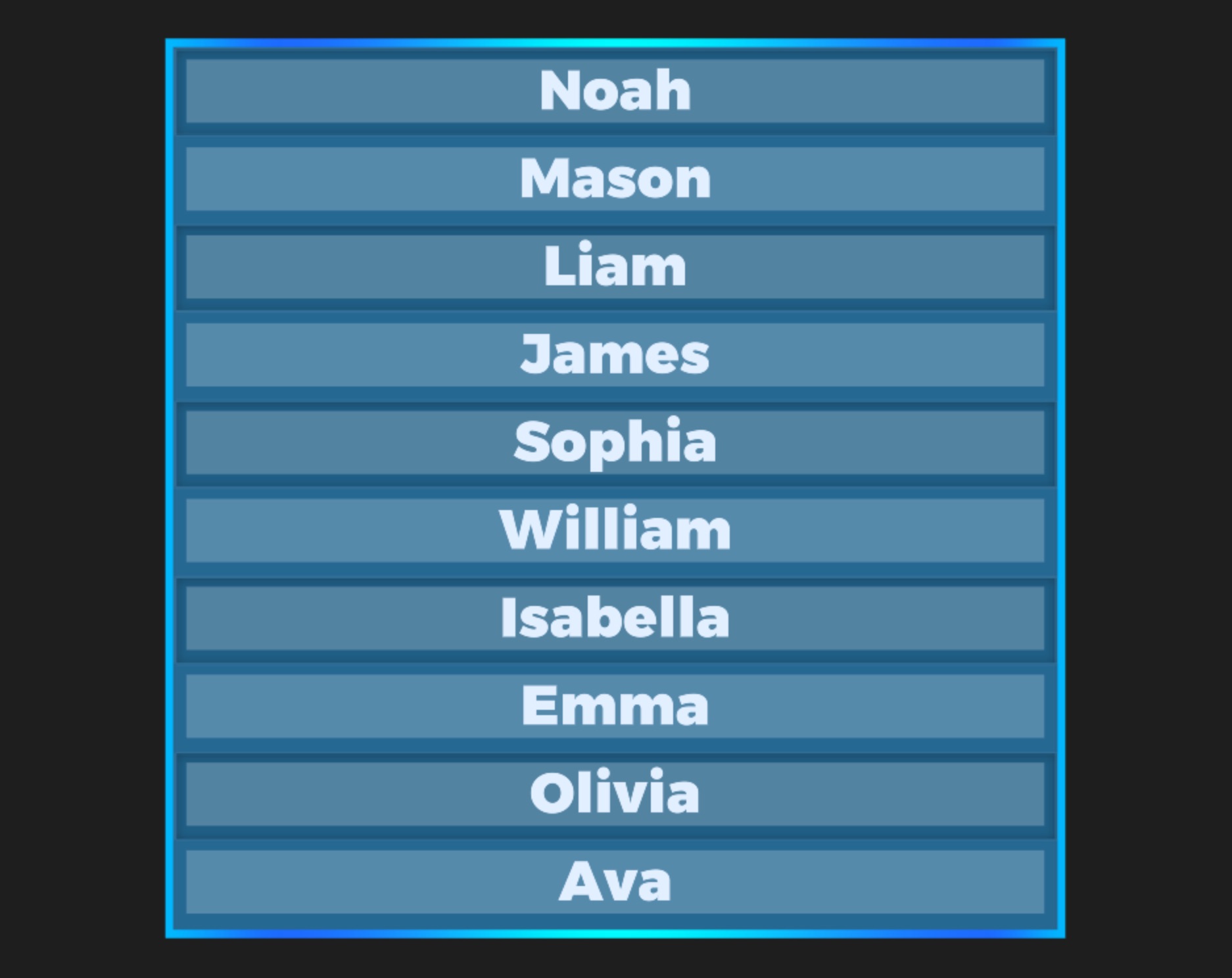 このリーダーボードは上部中央に揃えられた垂直の列として設定されています。幅フィッティング (Fitting) プロパティを使用して各アイテムの幅を最大に引き延ばします。パディング (Padding) プロパティとスペーシング (Spacing) プロパティを使用してセル同士の間にはっきりとギャップを残しています。