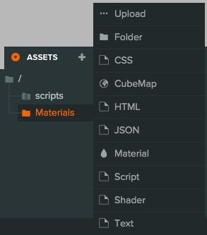 Create new material directly from the PlayCanvas Editor interface. In the Asset panel use the + button to open the New Asset menu and select Material.