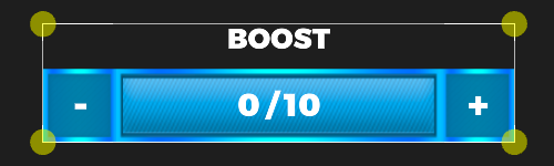 text-title: A Text Element for the title of the group - anchored to the top of the group.btn-minus: An Image Element that has a child Text Element. This is our minus button and it's anchored to the bottom left of the group.btn-plus: An Image Element that has a child Text Element. This is our plus button and it's anchored to the bottom right of the group.progress-bar: Our progress bar anchored to the bottom of the Group. This is an Image Element for the background of the progress bar and it has 2 child Elements:image-progress: The resizable Image Element that actually displays progress. Anchored to the left of theprogress-barElement.text: The Text Element that displays our stats. Anchored to the center of theprogress-barElement.