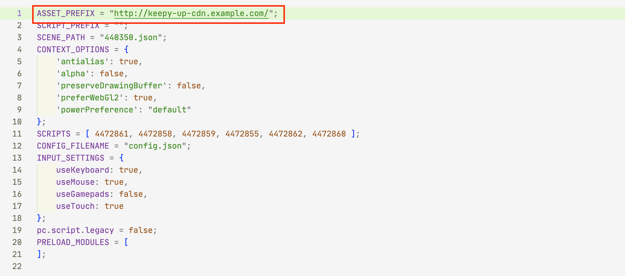 The ASSET_PREFIX will be prepended to all request that are made for an asset (including a scene) both during the preload phase and during runtime. For example, you should set this to the root folder of your CDN asset store. In the above example, previously an asset that would had a URL like files/123456/1/texture.jpg will now be loaded from http://keepy-up-cdn.example.com/files/123456/1/texture.jpg.
