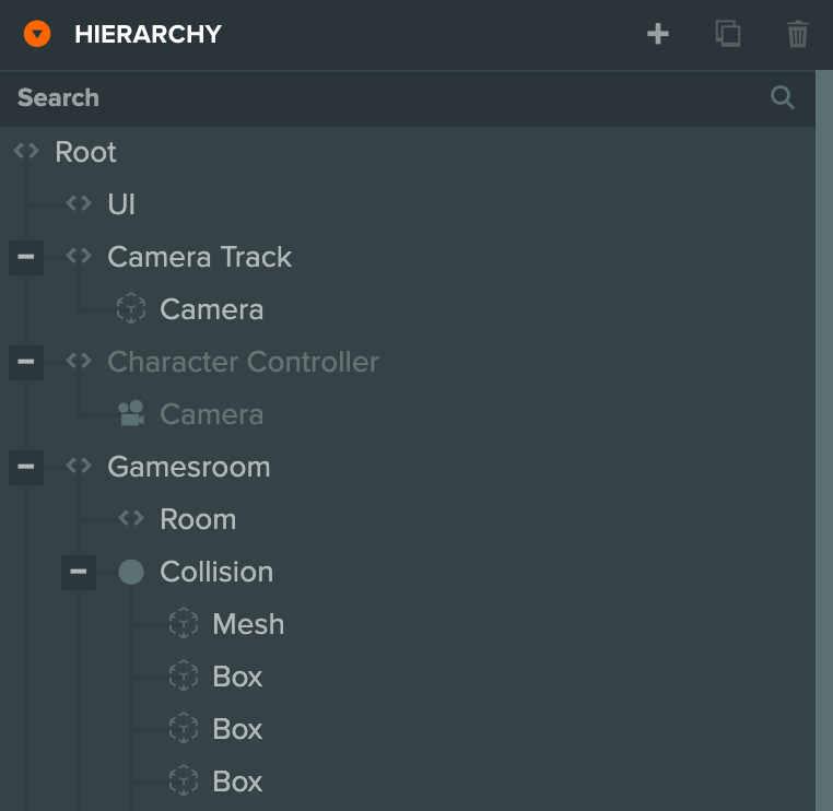 The Scene Hierarchy is a graph of Entities that can have Components to give these Entities behaviors such as having a mesh to render in the world or to play sound effects. They can also be given custom behavior with scripts.